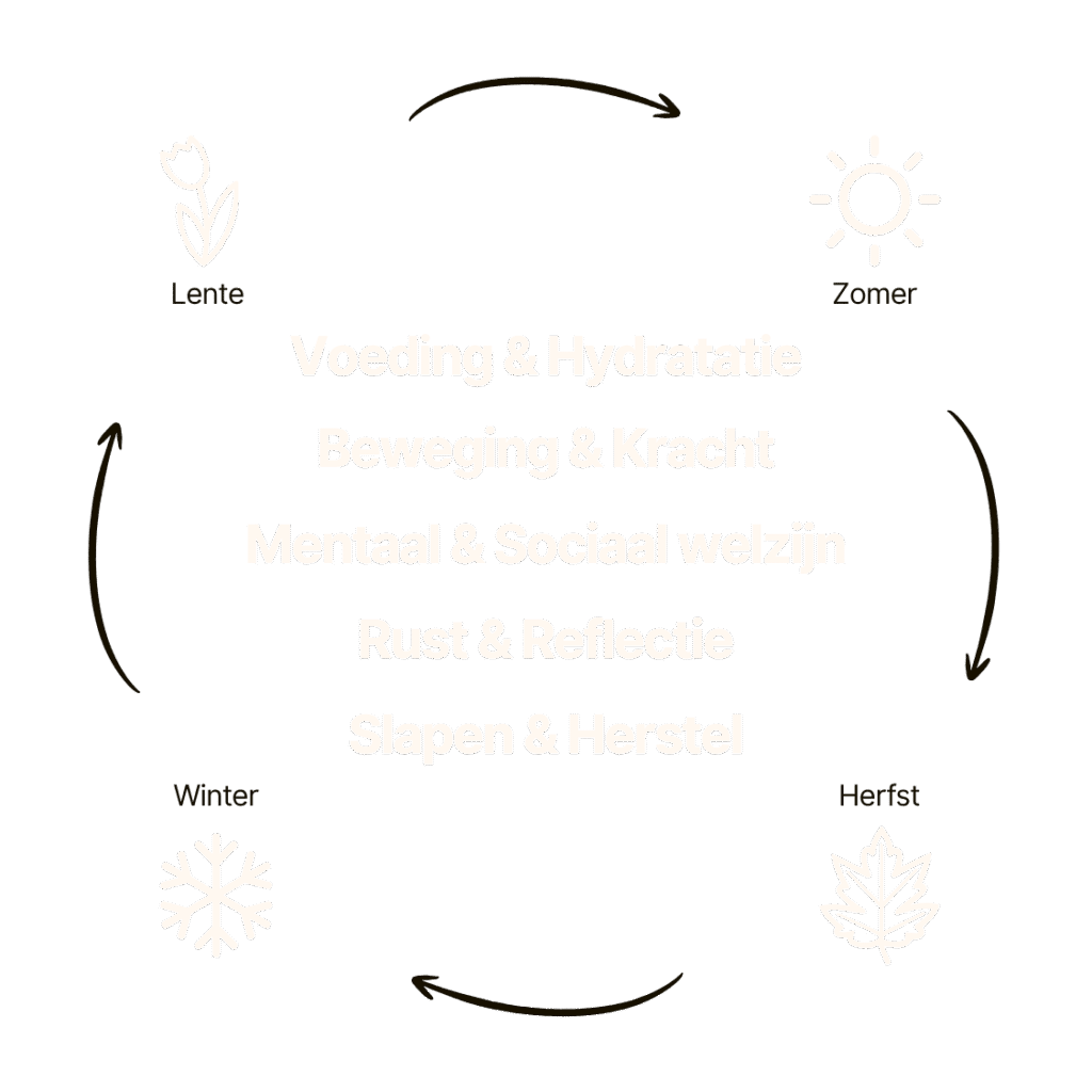 Het programma gebruikt de natuurlijke cyclus van de dag als leidraad. Elke dag is een miniatuurversie van je leven: een ritme van lente (ochtend), zomer (middag), herfst (avond) en winter (nacht). Elk moment vraagt om iets anders; energie opbouwen, presteren, afronden of herstellen. Door de vijf elementen in deze seizoenen te verweven, leef je meer in balans met jezelf én met je natuurlijke ritme.